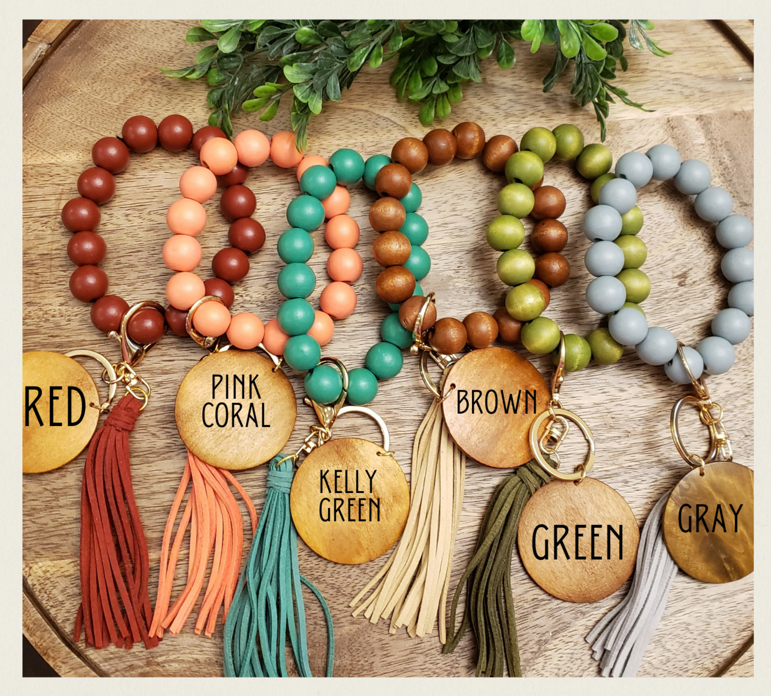 Beaded bracelet includes keychain, suede leather tassel, and wood disk.