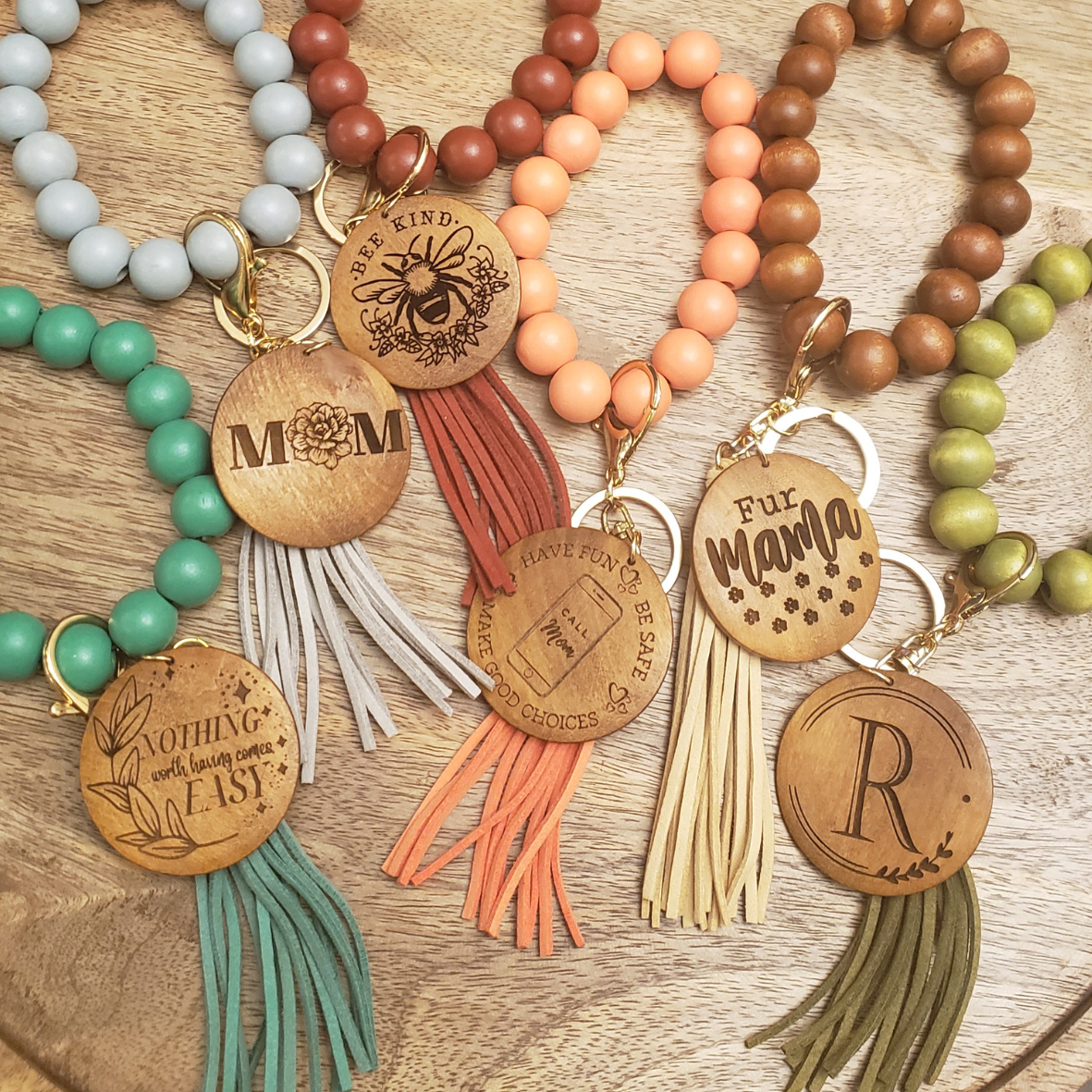 These beautiful wooden beaded wristlet keychains are not only fashionable, but practical! Keep your hands free and your keys safe when you are out and about.